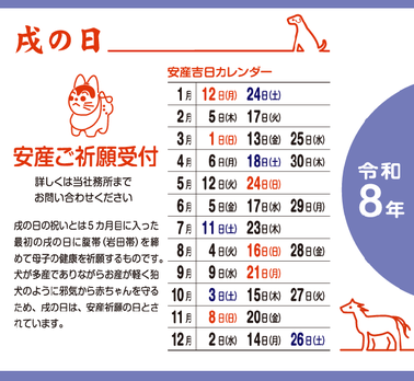 「戌の日の安産祈願」というのも一つの基準であって、必ずしもこの日に参詣しなければならないというものでもありません。体調の良い日に家族お揃いで参詣してください。